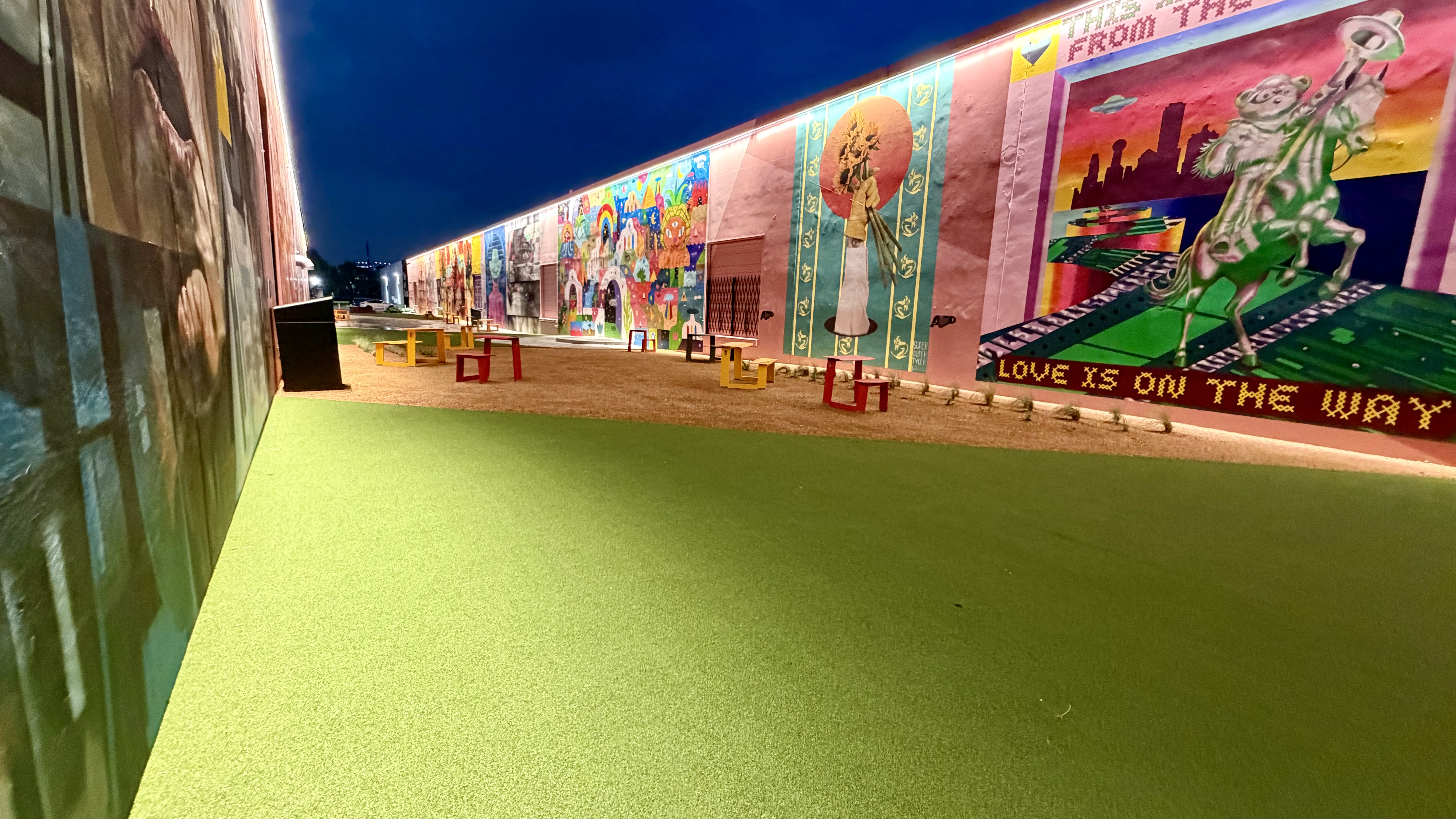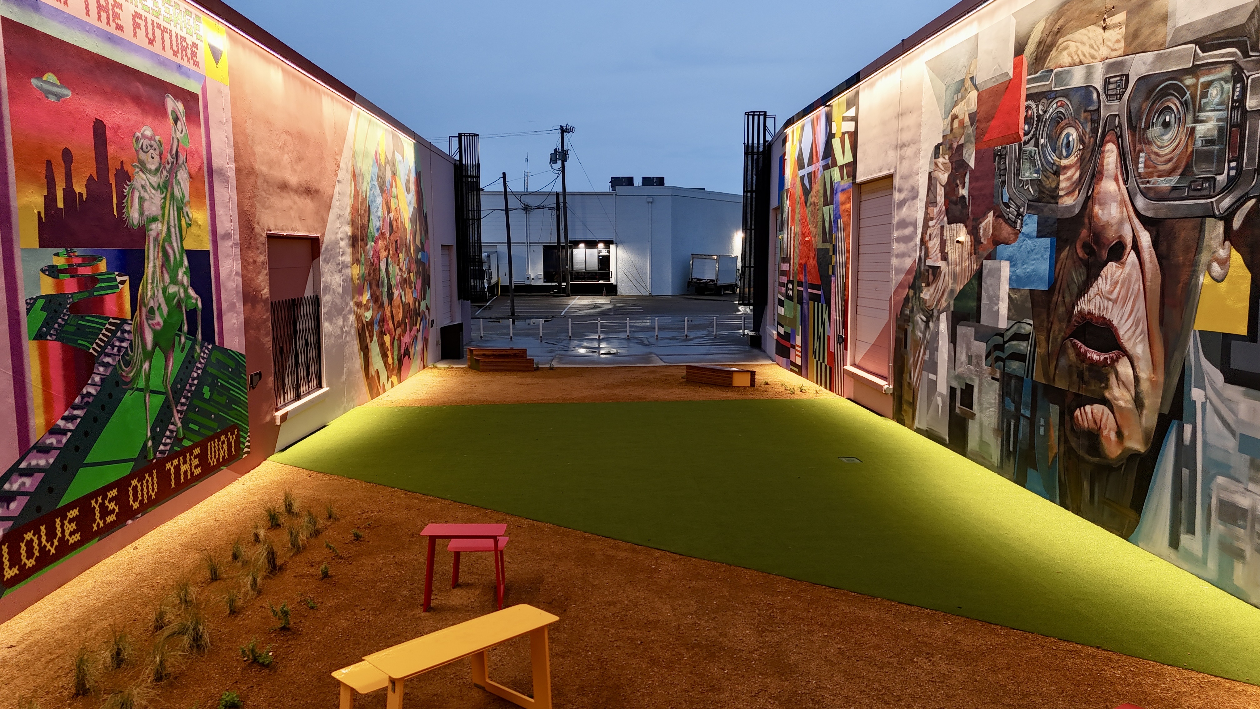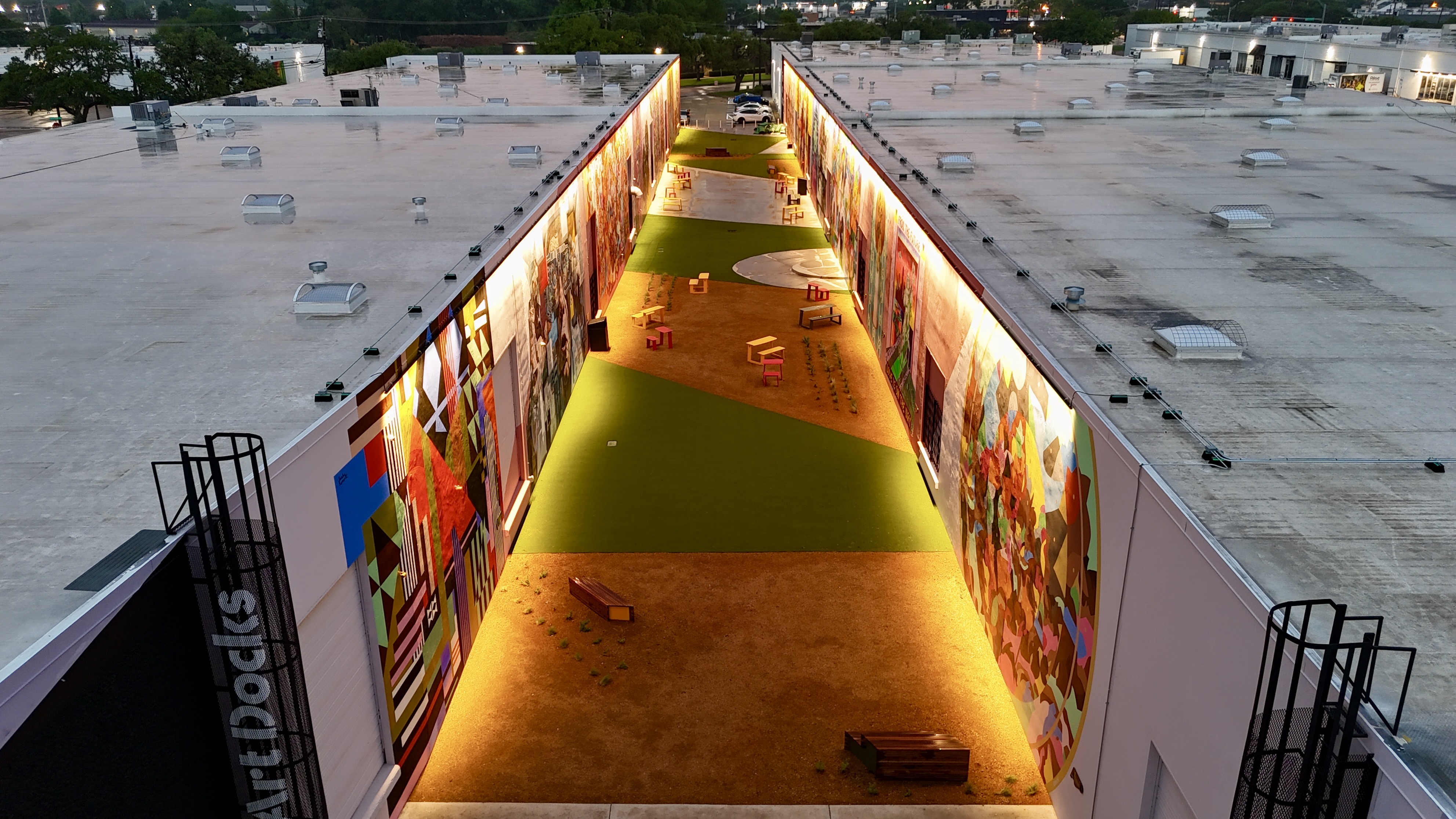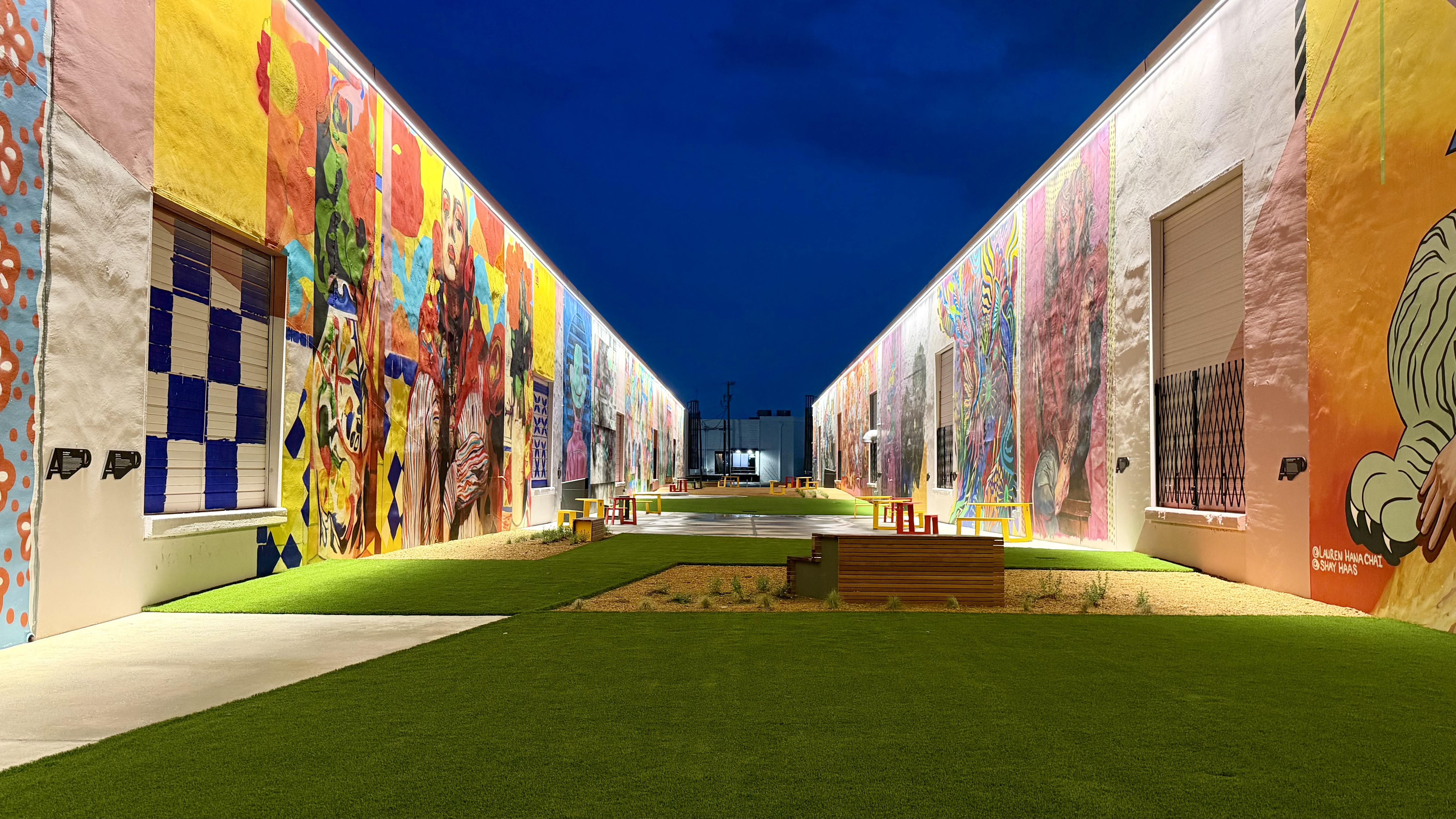 The Art Docks is the centerpiece of M2G Ventures’ reimagining of the Inwood Design District — the 40-acre, 14-building mixed-use campus they acquired in 2025 between Dallas Love Field and the Design District proper. The Art Docks itself transforms a long industrial alleyway into a curated, lit, sound-tracked outdoor mural gallery: 18 commissioned artists, 11 of them Texas-based, with international contributors from Spain and London.