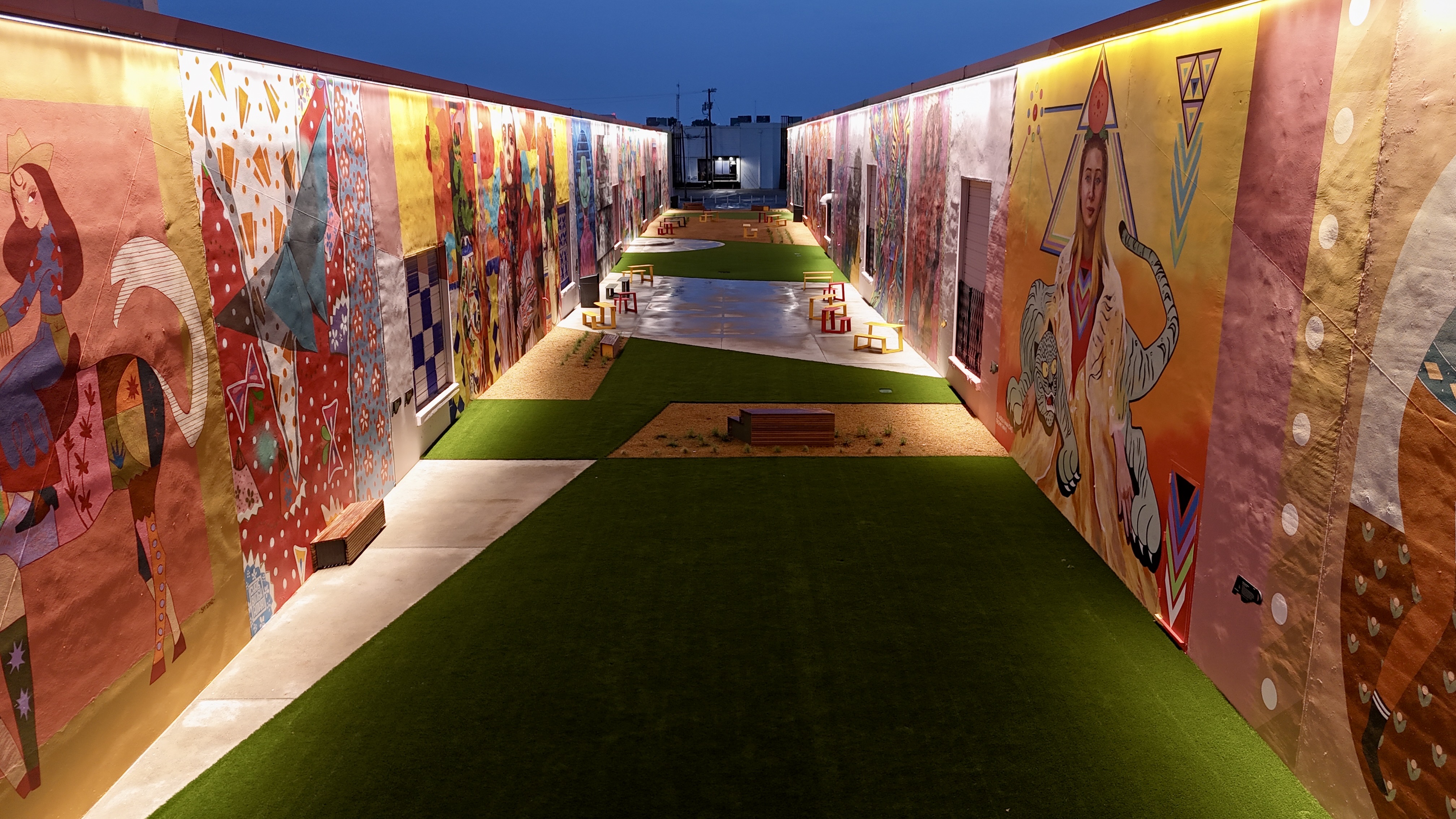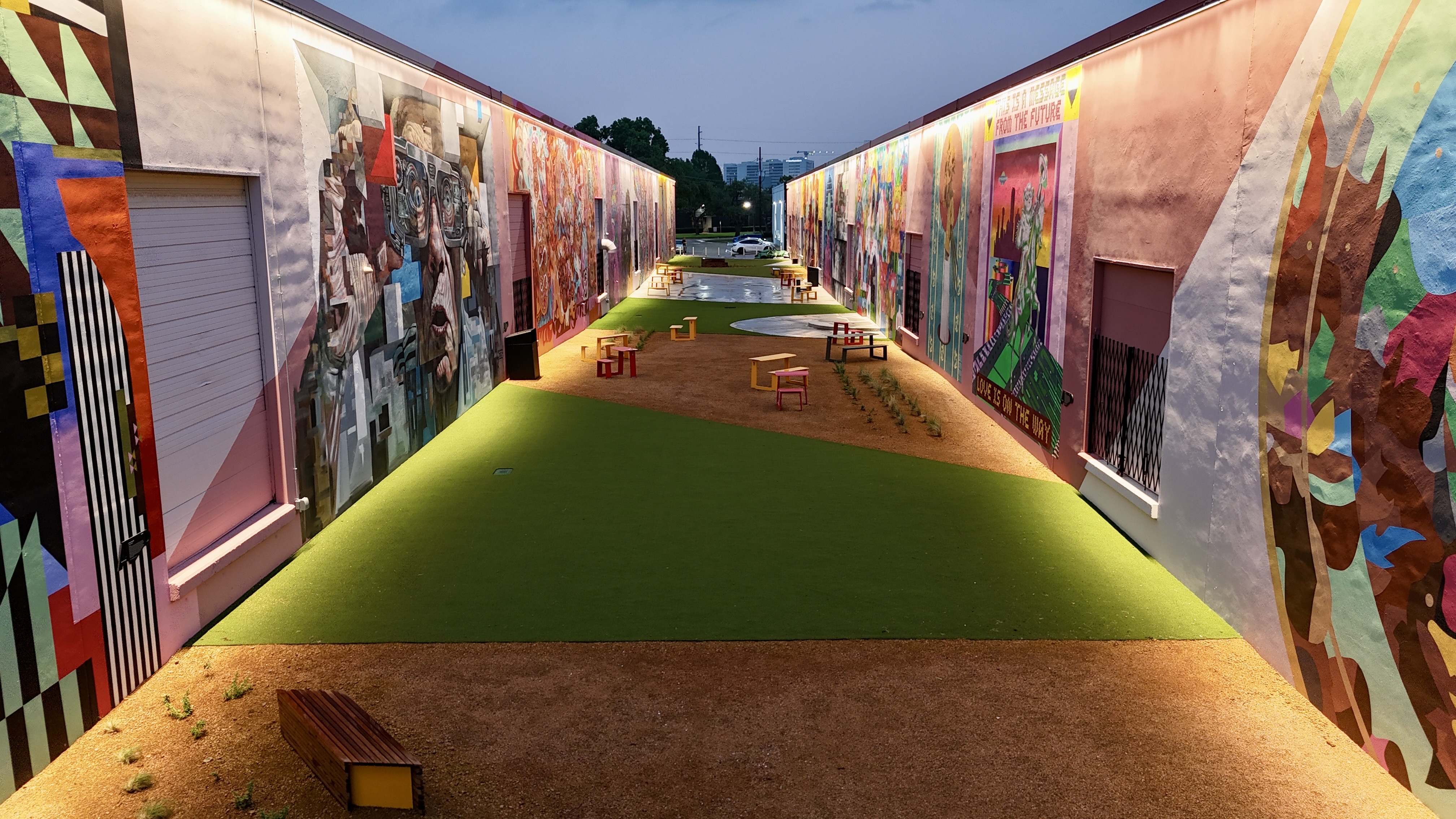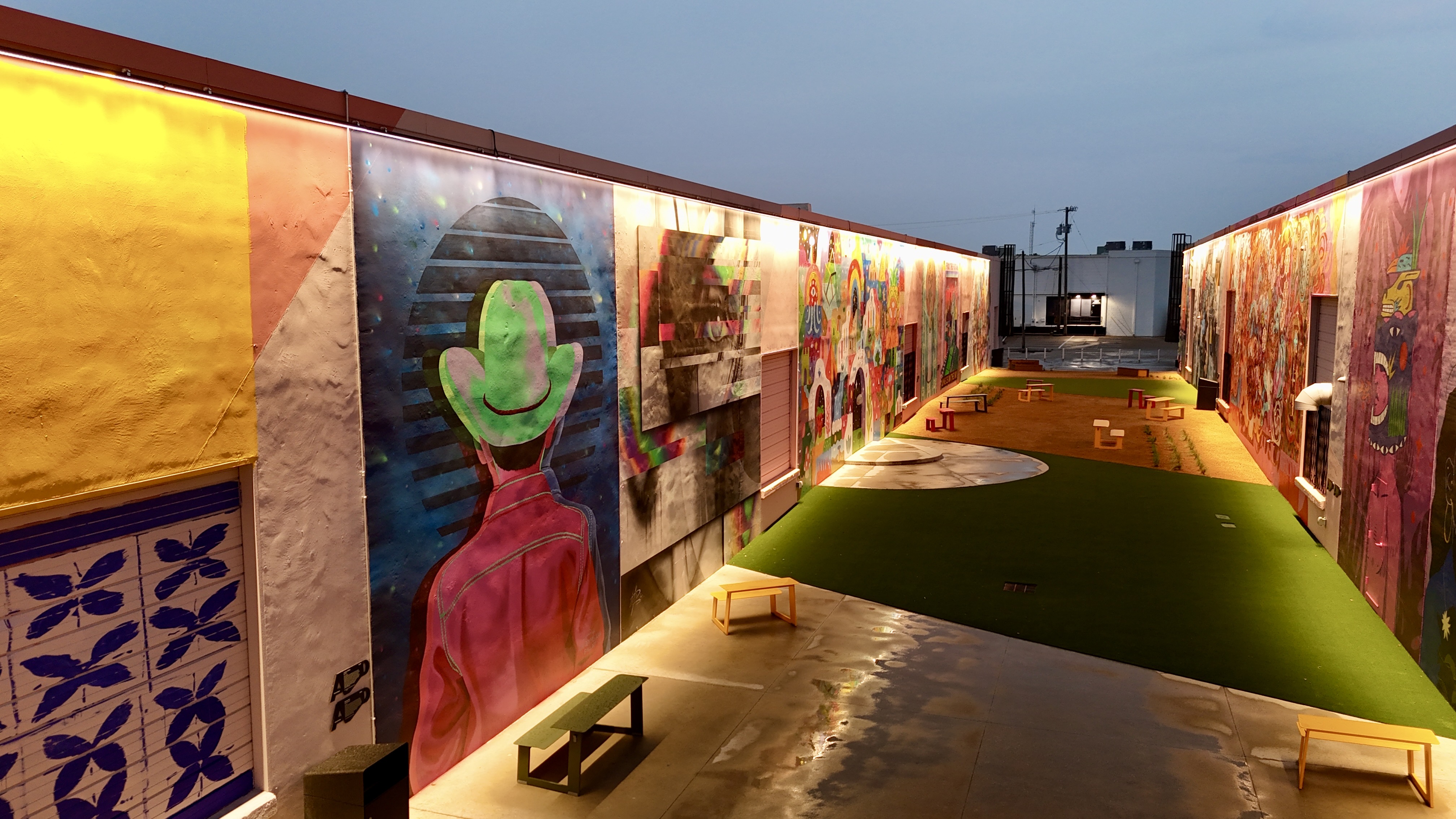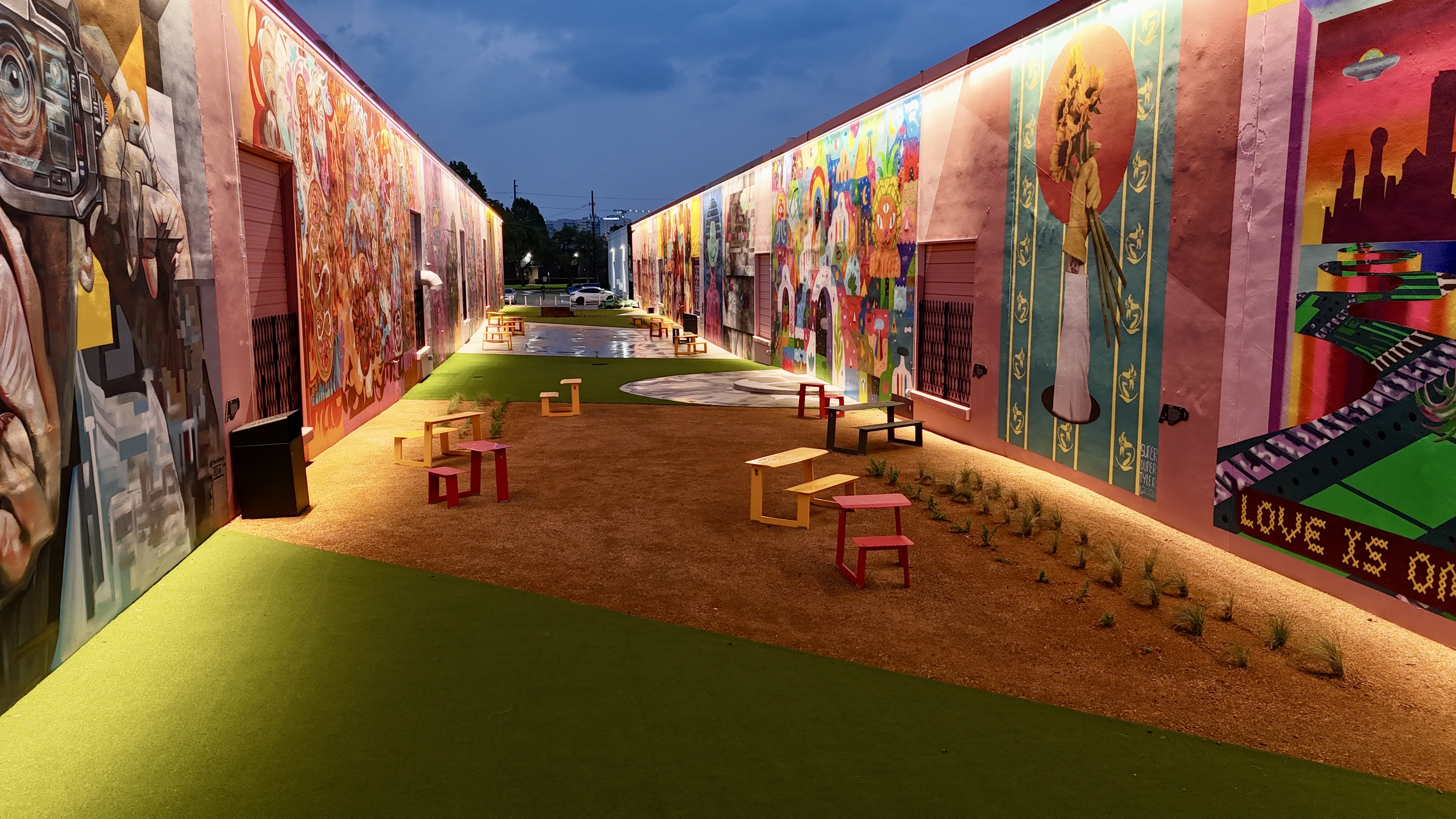 The Art Docks is the centerpiece of M2G Ventures’ reimagining of the Inwood Design District — the 40-acre, 14-building mixed-use campus they acquired in 2025 between Dallas Love Field and the Design District proper. The Art Docks itself transforms a long industrial alleyway into a curated, lit, sound-tracked outdoor mural gallery: 18 commissioned artists, 11 of them Texas-based, with international contributors from Spain and London.