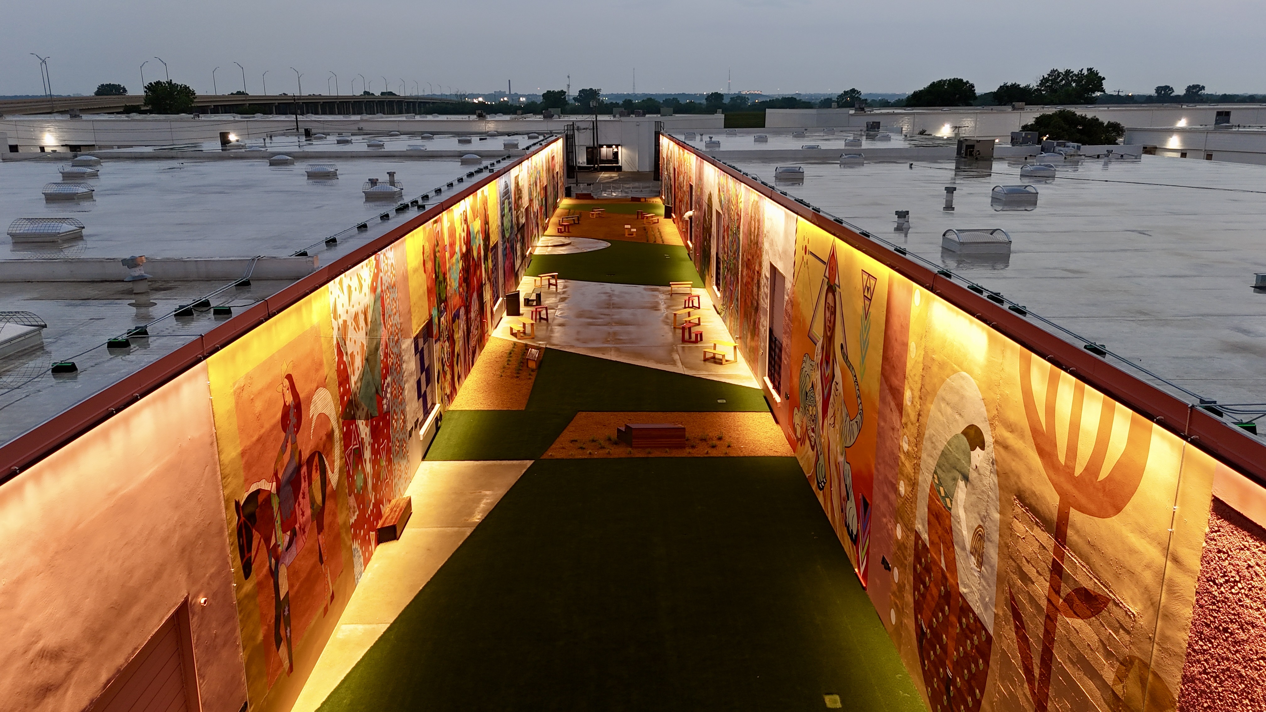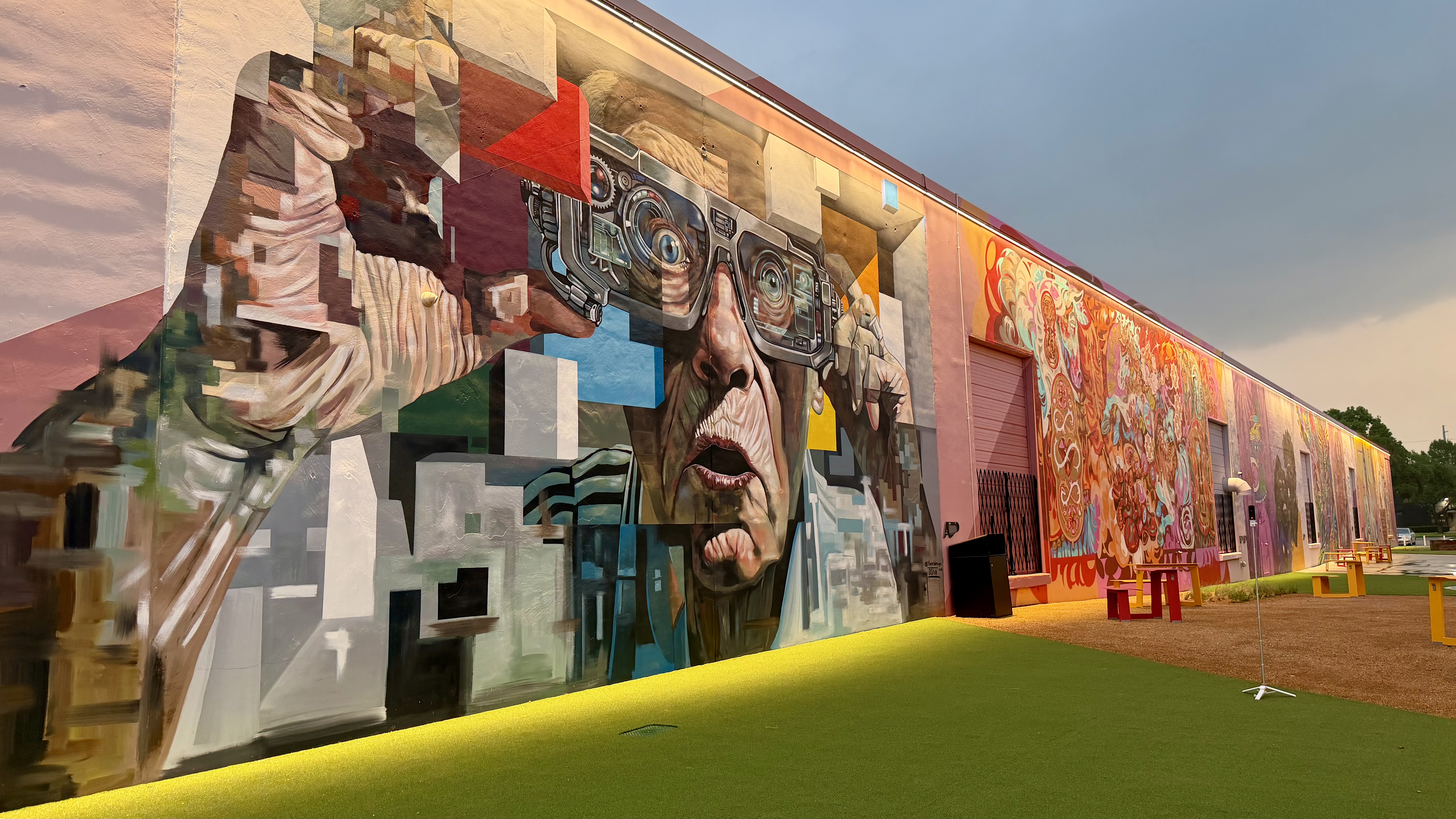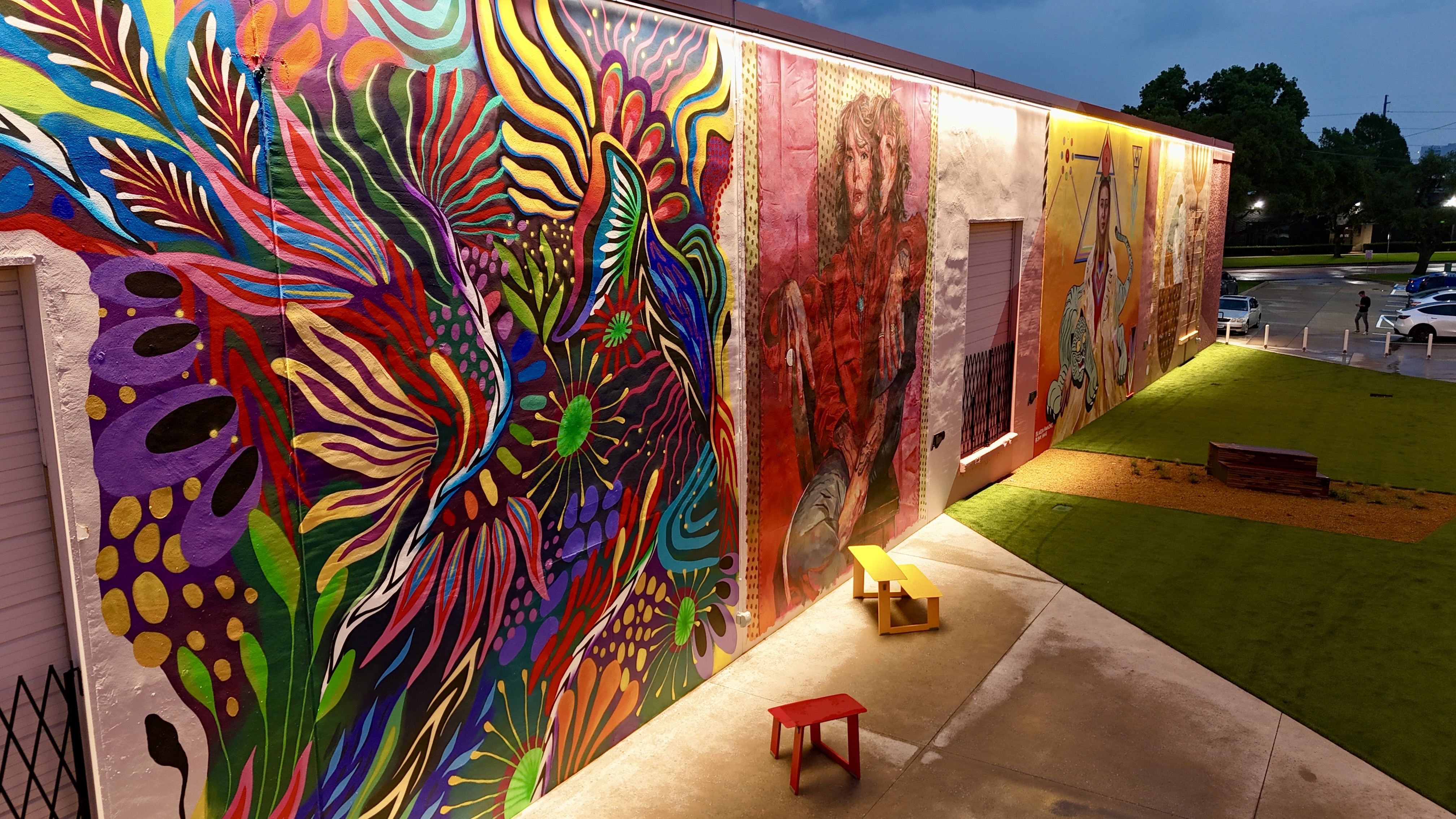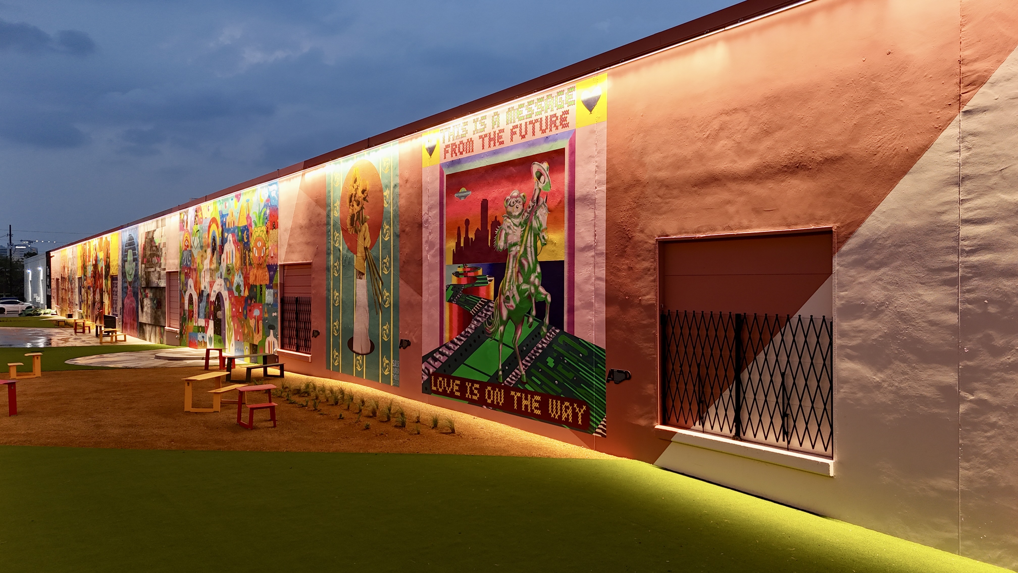 The Art Docks is the centerpiece of M2G Ventures’ reimagining of the Inwood Design District — the 40-acre, 14-building mixed-use campus they acquired in 2025 between Dallas Love Field and the Design District proper. The Art Docks itself transforms a long industrial alleyway into a curated, lit, sound-tracked outdoor mural gallery: 18 commissioned artists, 11 of them Texas-based, with international contributors from Spain and London.