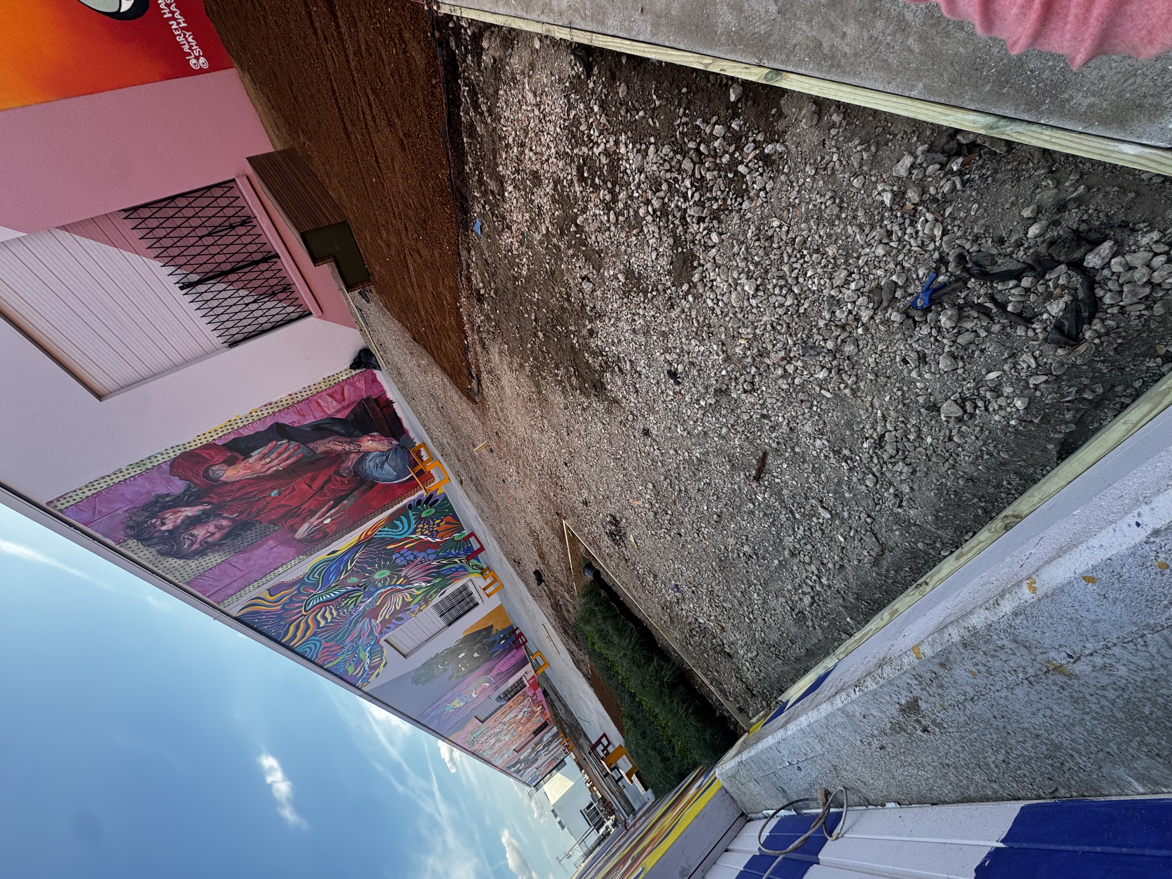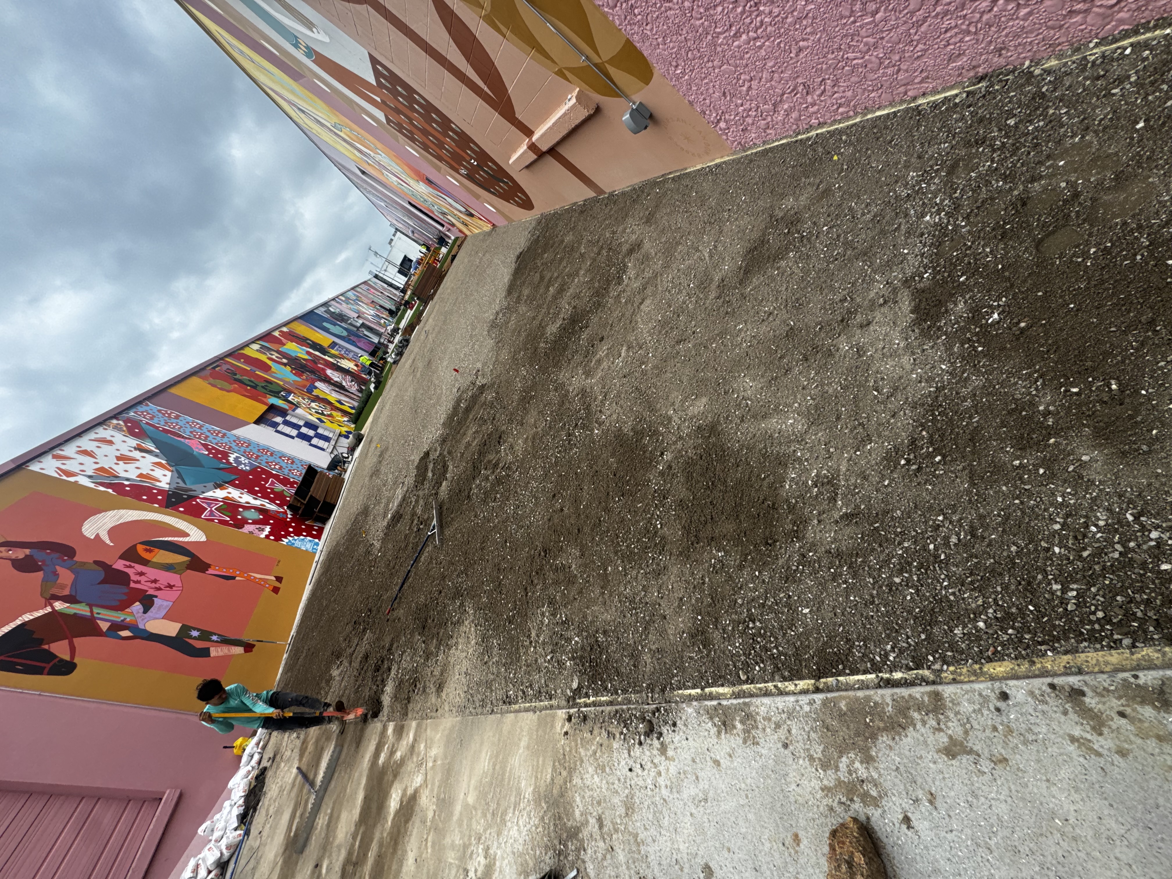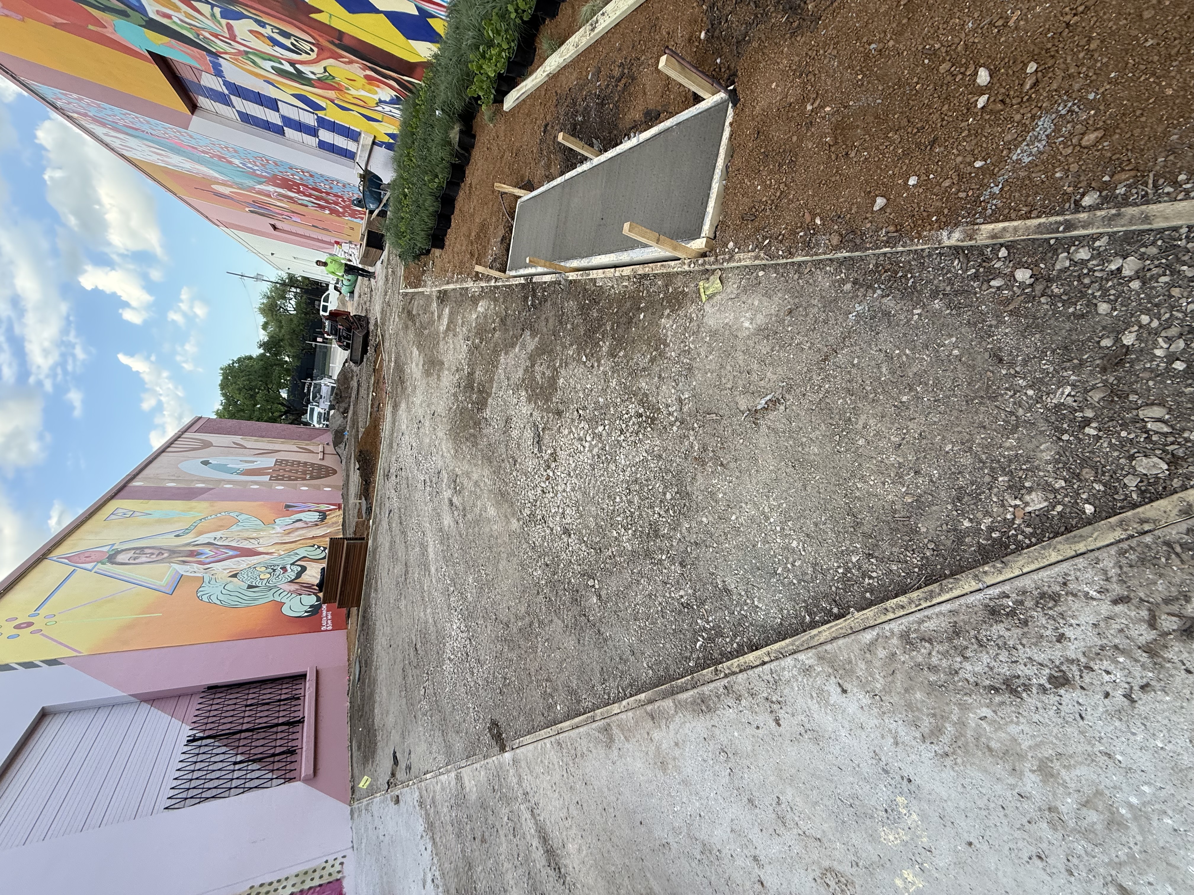 The Art Docks sits in a flat industrial alley between two buildings. Water has nowhere to go on its own. Get drainage wrong on a developer-funded commercial install and you’ve built a public space that turns into a pond every time North Texas gets a real storm — the kind of failure mode that ends a developer relationship.