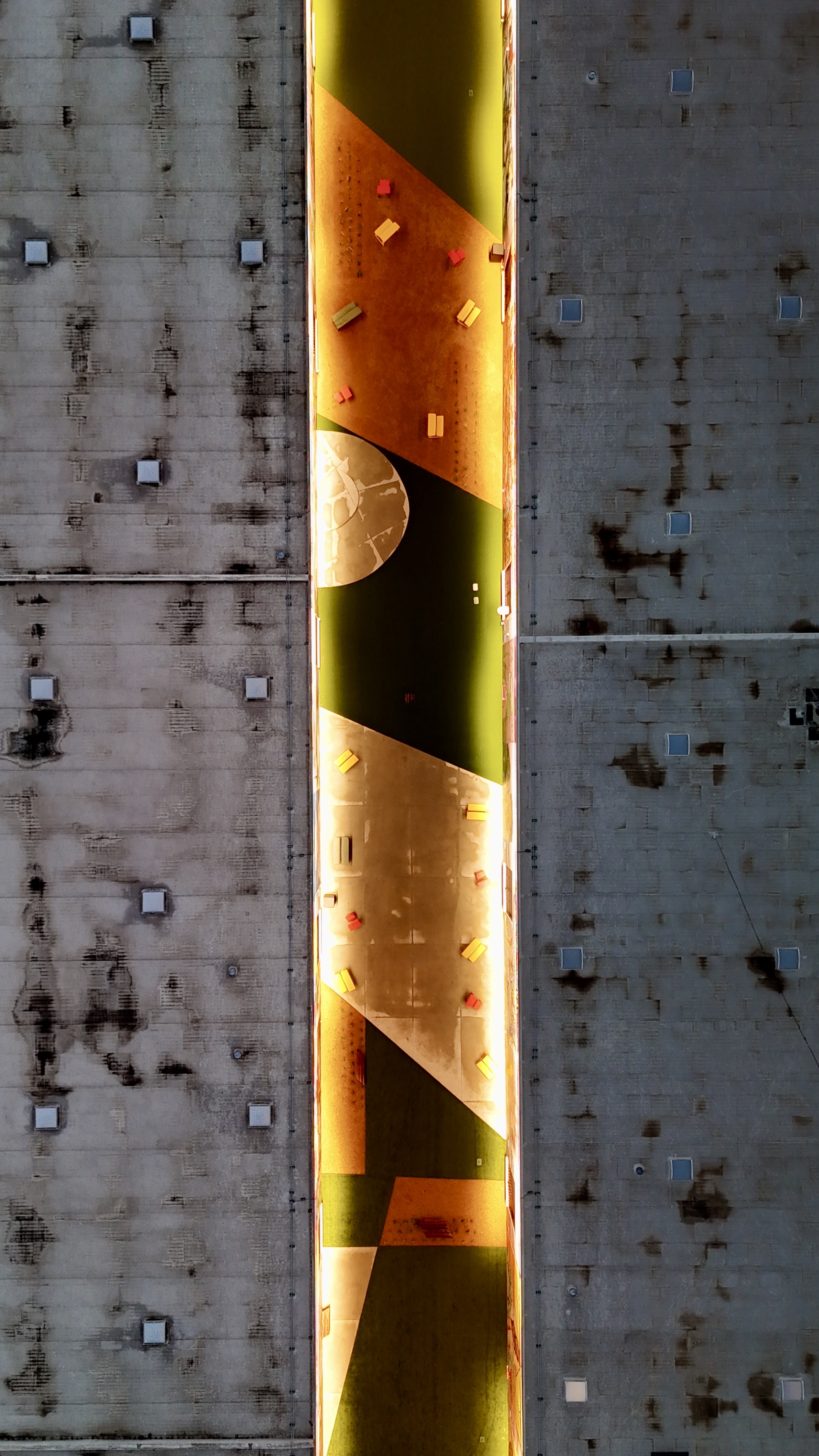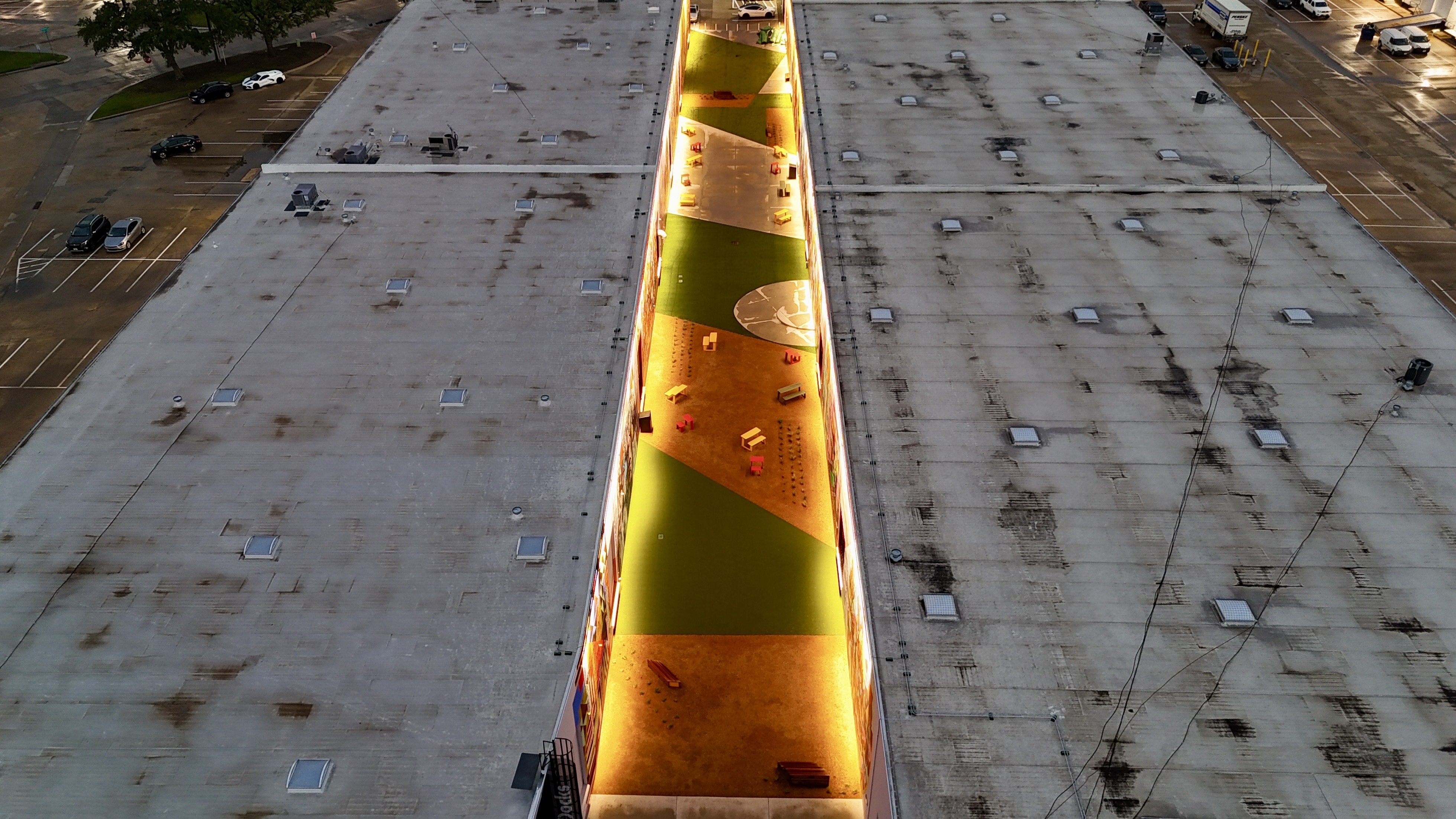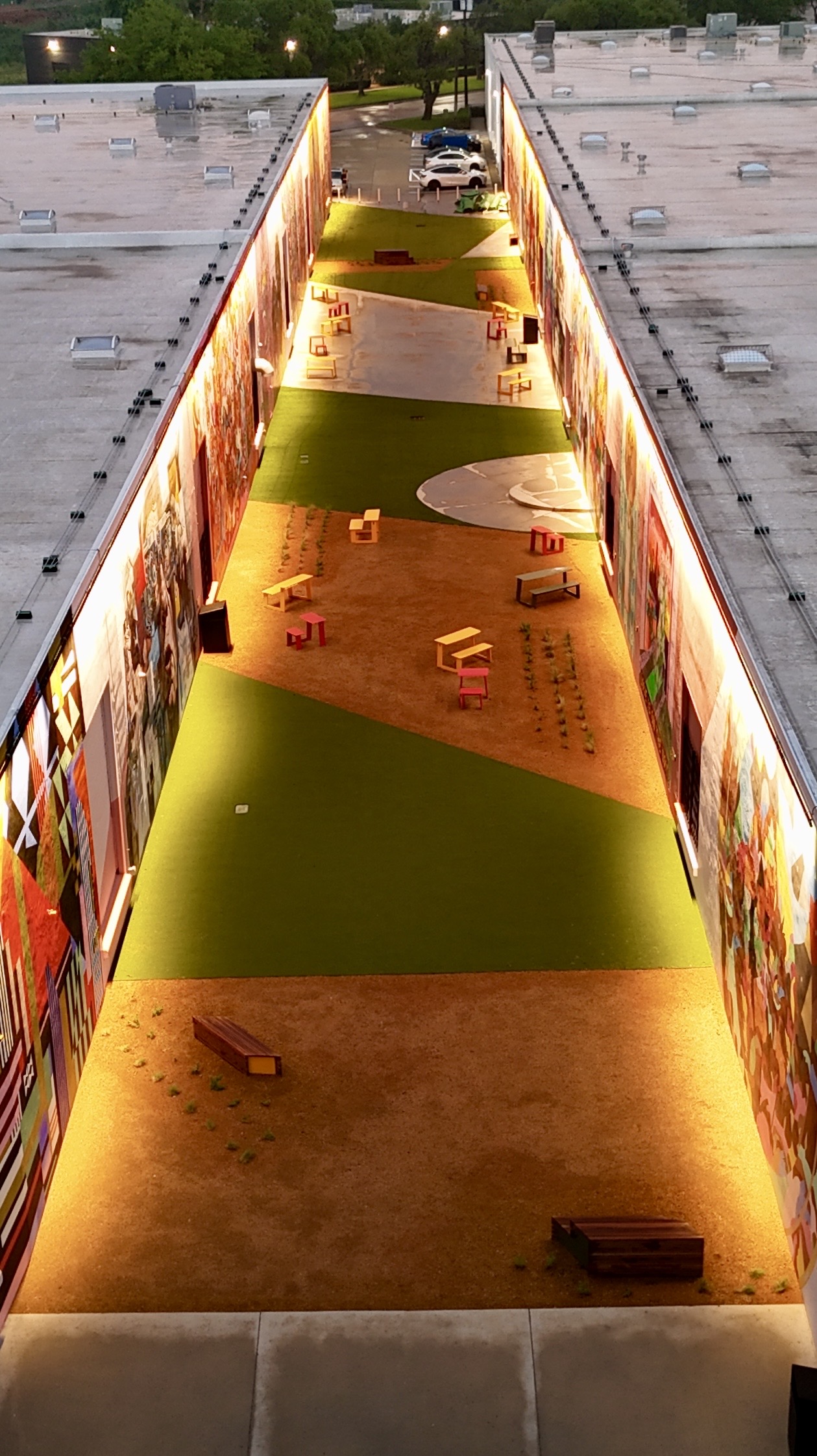 The Art Docks sits in a flat industrial alley between two buildings. Water has nowhere to go on its own. Get drainage wrong on a developer-funded commercial install and you’ve built a public space that turns into a pond every time North Texas gets a real storm — the kind of failure mode that ends a developer relationship.
